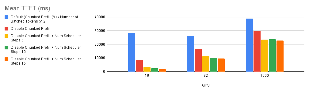 --num-scheduler-stepsto a value between 10 and 15 to optimize GPU utilization and performance. - Prefix Caching: Combining prefix caching with chunked prefill can enhance performance in specific scenarios. However, if user requests have a low prefix caching hit rate, it might be advisable to disable both chunked prefill and prefix caching.