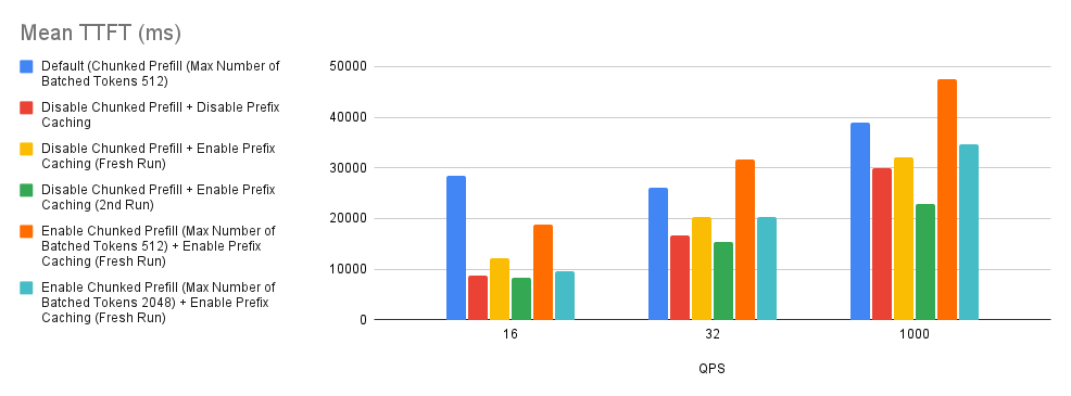 - In our experiments we found that the prefix caching hit rates of Bar 3 (yellow) and Bar 4 (green) are around 0.9% and 50%. Based on the comparison of Bar 3 (yellow) and Bar 4 (green) with the baseline and Bar 2 (red), this tells us that if the user requests do not have high prefix caching hit rate, disabling both chunked prefill and prefix caching might be considered a good rule of thumb.